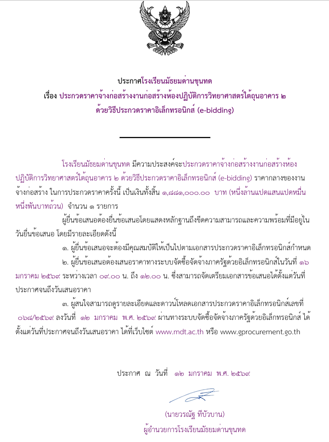 เรื่อง ประกวดราคาจ้างก่อสร้างงานก่อสร้างห้องปฏิบัติการวิทยาศาสตร์ใต้ถุนอาคาร ๒